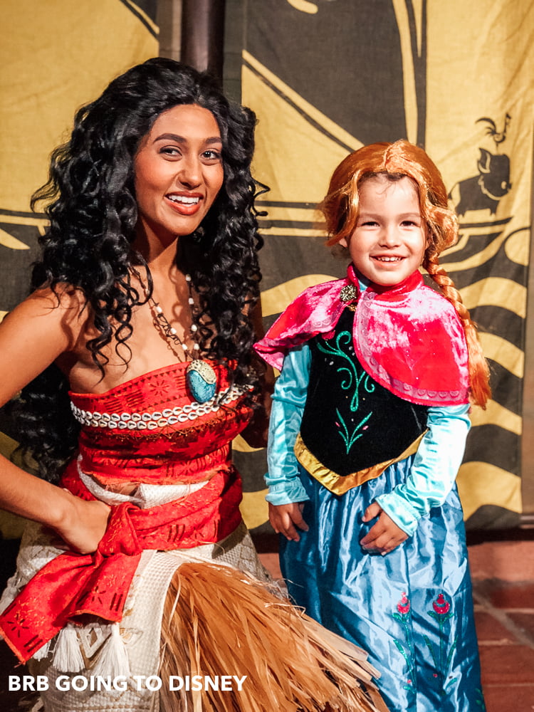 We then enjoyed a ride on Aladdin’s carpets. It was just about 6:00 so after our magic carpet ride, we ventured towards the Tiki room to get in-line for the Moana meet-and-greet. After walking into the queue, we literally waited about 5 minutes and walked right up to Moana! Although the party starts at 7, Moana was already greeting guests at 6!